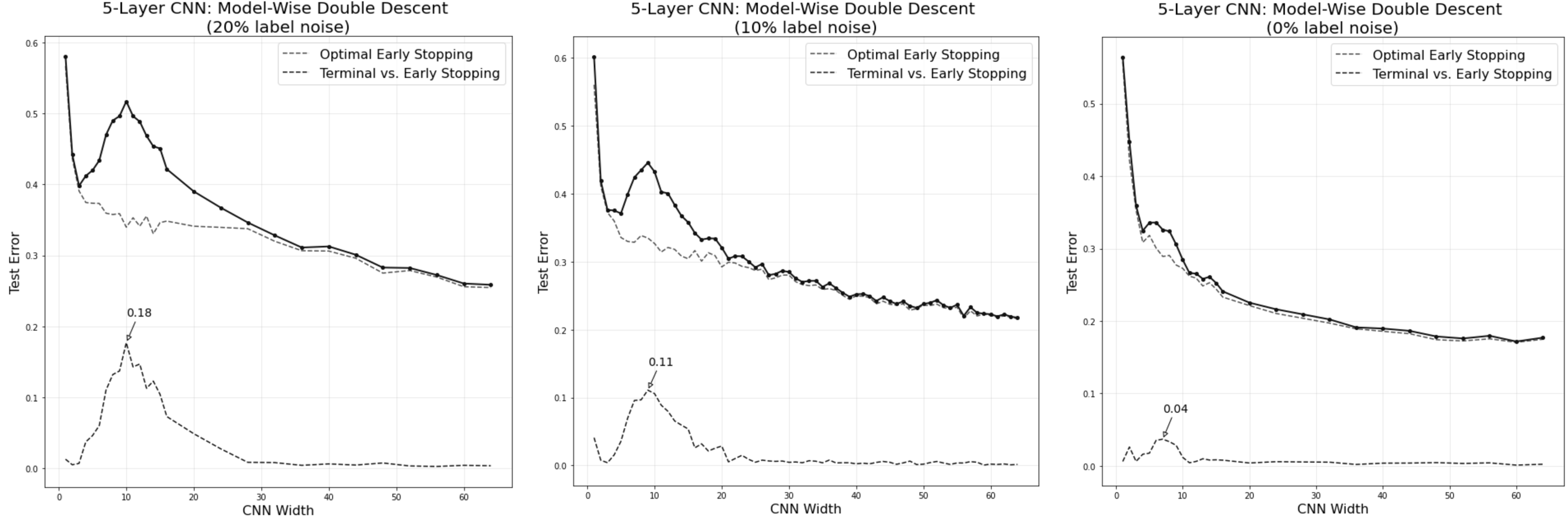我们比较了具有不同复杂度和不同标签噪声的几种模型,这极大地影响了峰的位置和相对高度。 事实上,提前停止可以平滑过度拟合曲线,从而返回最佳结果。 这符合提前停止可以避免过度拟合的常识。